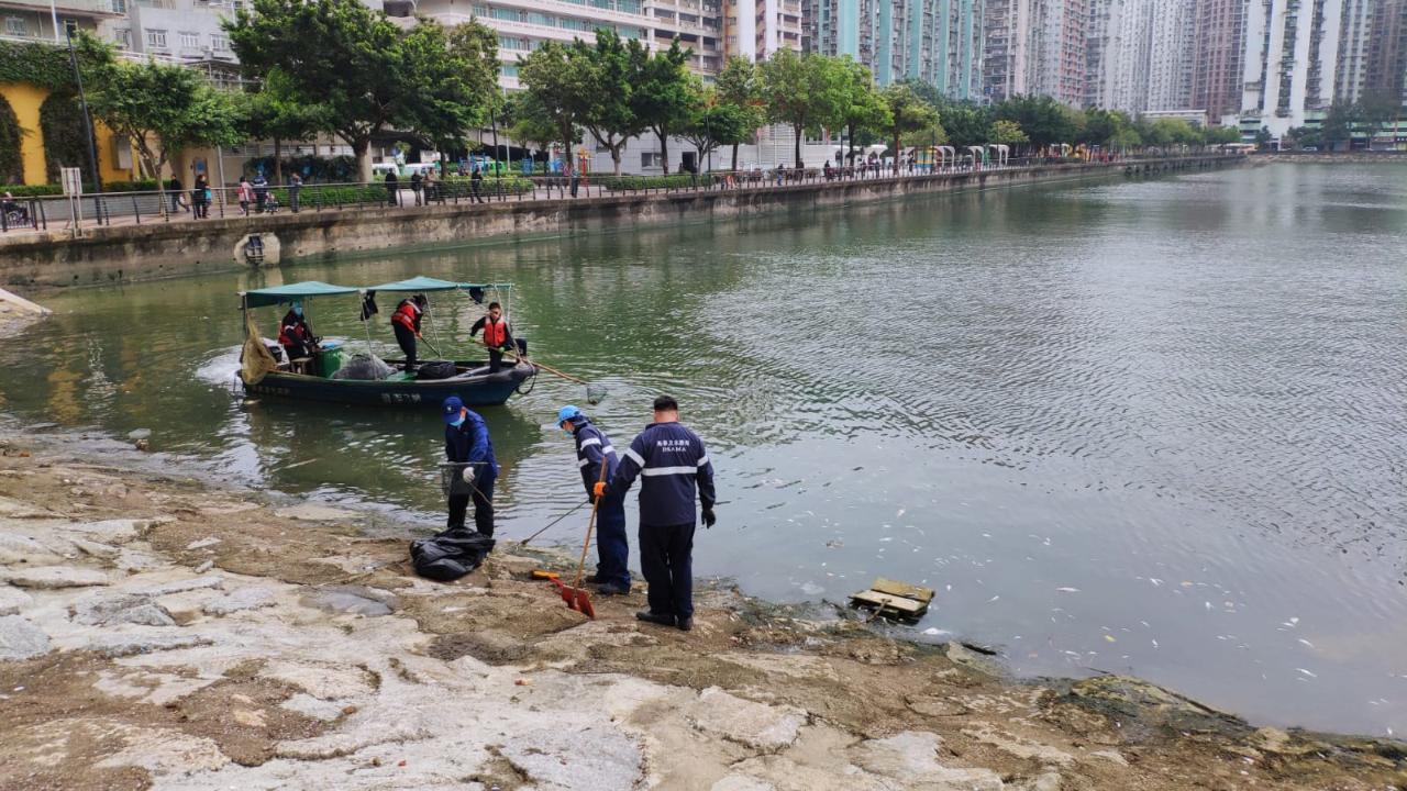 近日海事及水務局於筷子基北灣附近海面發現死魚,隨即派員和船隻到現場加緊清理,以保持海面環境清潔。星期日至今海事局共清理了800公斤死魚,今早(12)筷子基海面仍有零星死魚漂出,局方繼續跟進清理工作。