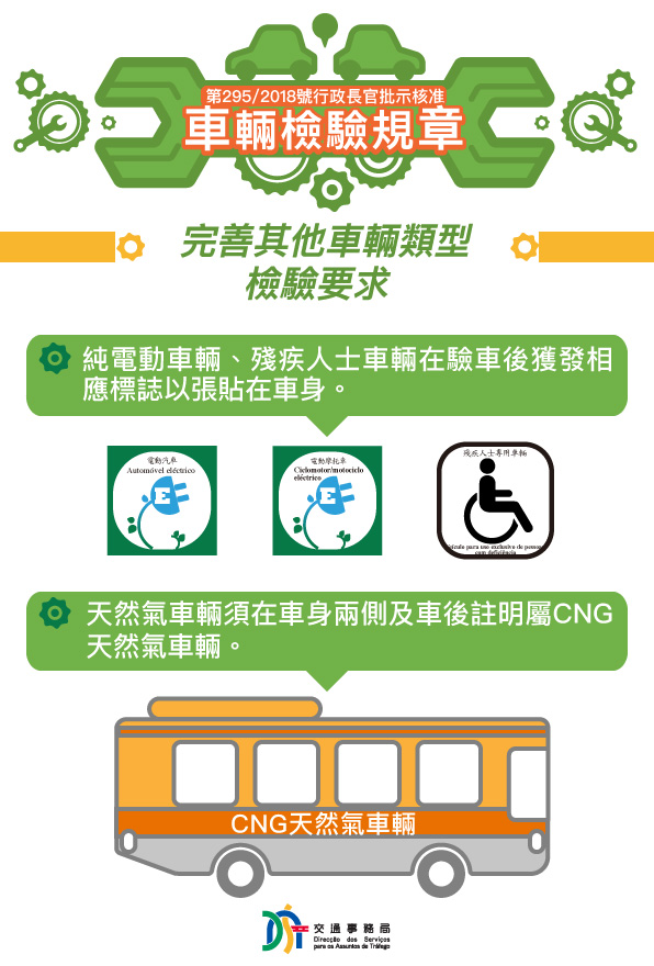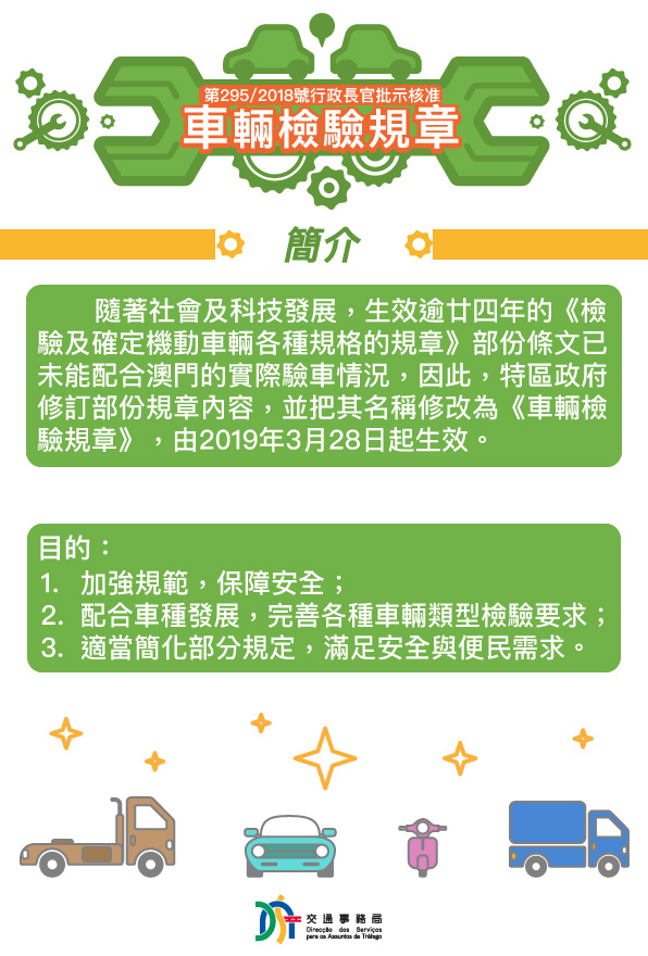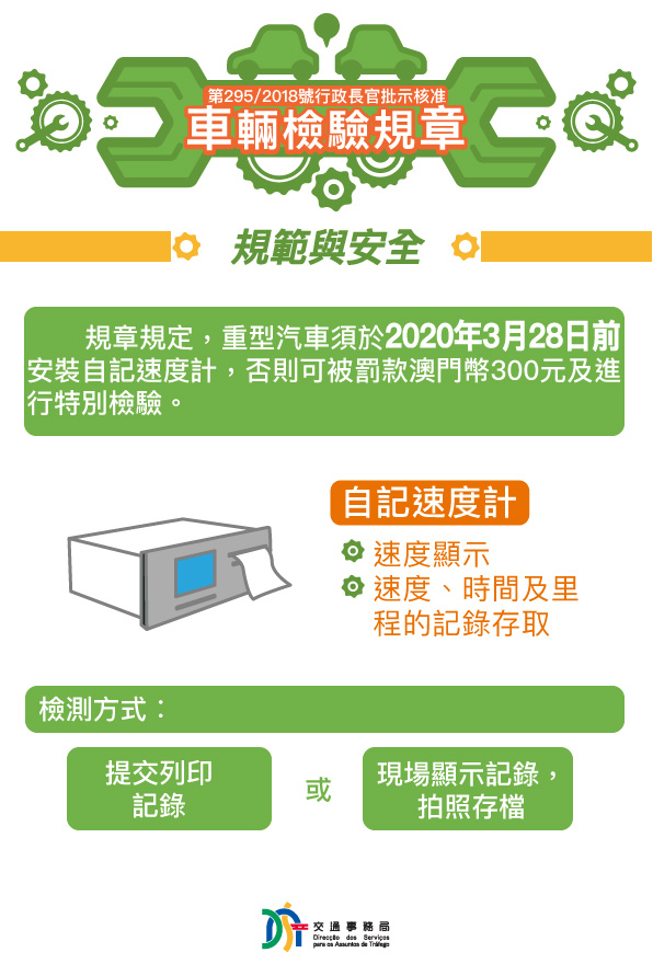 為加強規範及保障道路使用者的安全,第295/2018號行政長官批示核准的《車輛檢驗規章》由2019年3月28日(周四)起取代《檢驗及確定機動車輛各種規格的規章》,並有部份修訂內容,包括要求重型汽車自規章生效一年內需安裝自記速度計、完善各類車輛類型的檢驗要求及適當簡化部份規定等,以配合驗車的實際情況及科技發展。