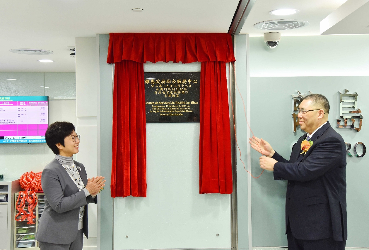 及後,行政長官崔世安在行政法務司司長陳海帆陪同下進行牌匾揭幕儀式,標誌中心正式啟用,為市民提供多元及便捷的公共服務,進一步便利市民。