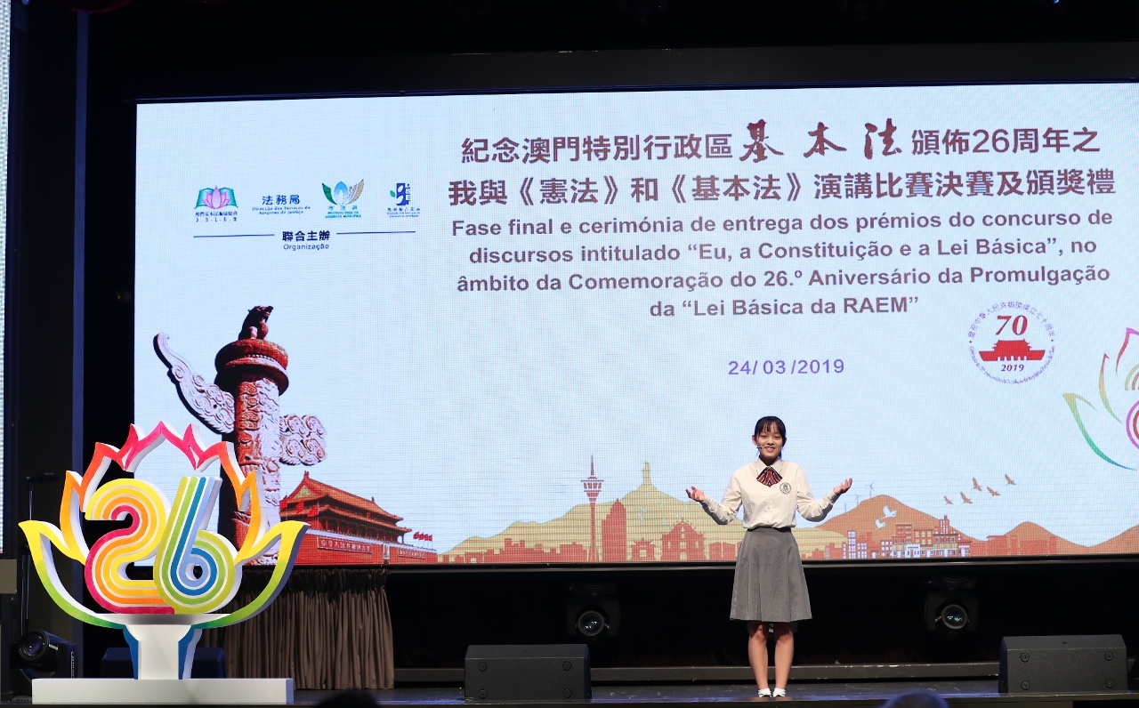 適逢新中國成立70周年和澳門回歸祖國20周年,澳門基本法推廣協會、法務局、市政署和教育暨青年聯合主辦,澳門我是演講家協會承辦,“紀念《澳門特別行政區基本法》頒佈26年之我與《憲法》《基本法》演講比賽”決賽及頒獎禮,於324日假聖保祿學校禮堂順利舉行。