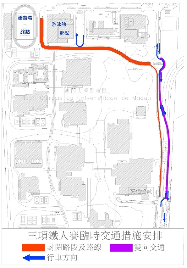 配合體育局舉行三項鐵人賽,4月7日(周日)上午6時至11時30分,澳門大學校園多處道路實施一系列臨時交通安排,其間“澳大/綜合體育館”、“澳大/大學展館”、“澳大/中央教學樓”巴士站暫停使用,交通事務局呼籲公眾留意。
