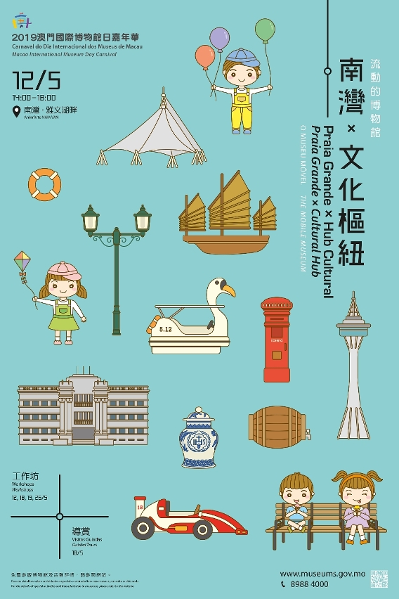 為響應5‧18國際博物館日,澳門14間博物館將以“流動的博物館——南灣x文化樞紐”為主題,聯合舉辦年度盛事“澳門國際博物館日嘉年華”。開幕儀式將於5月12日下午3時在南灣‧雅文湖畔舉行,並邀請廣東省的文博機構、香港民政事務局及其轄下博物館代表出席,歡迎公眾參與。