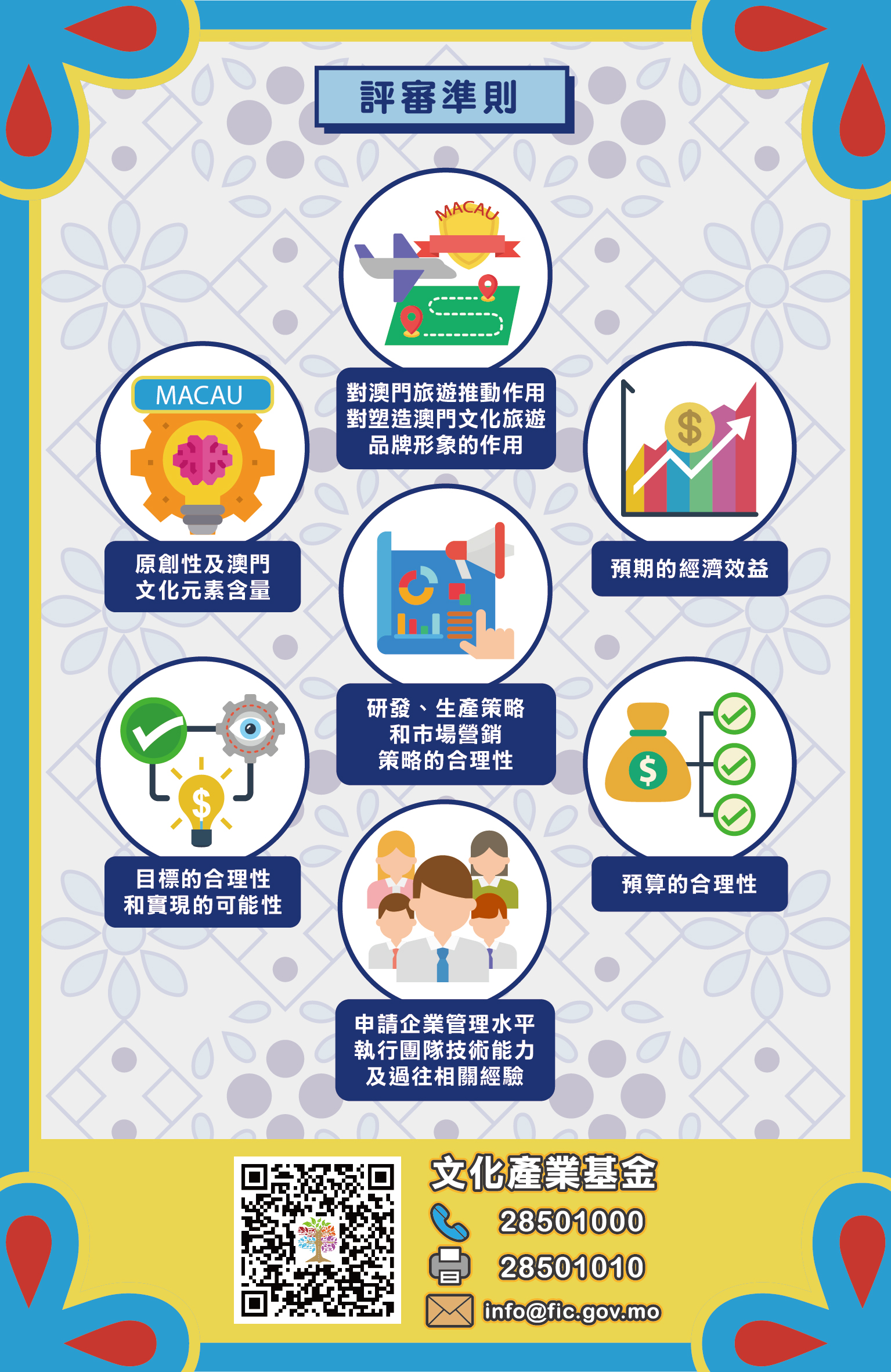 申請計劃書須包括設計概念、推廣及營銷方案、市場分析,開發文化旅遊產品需包括產品設計圖,開發文化旅遊體驗服務則要提交圖文或視頻說明、產品設計圖。評審將根據申請項目對澳門旅遊推動作用、對塑造澳門文化旅遊品牌形象作用、原創性及澳門文化元素含量、預期的經濟效益、目標的合理性和實現的可能性、預算的合理性、申請企業管理水平、執行團隊技術能力及過往相關經驗,以及研發、生產策略和市場營銷策略的合理性作為評審準則。