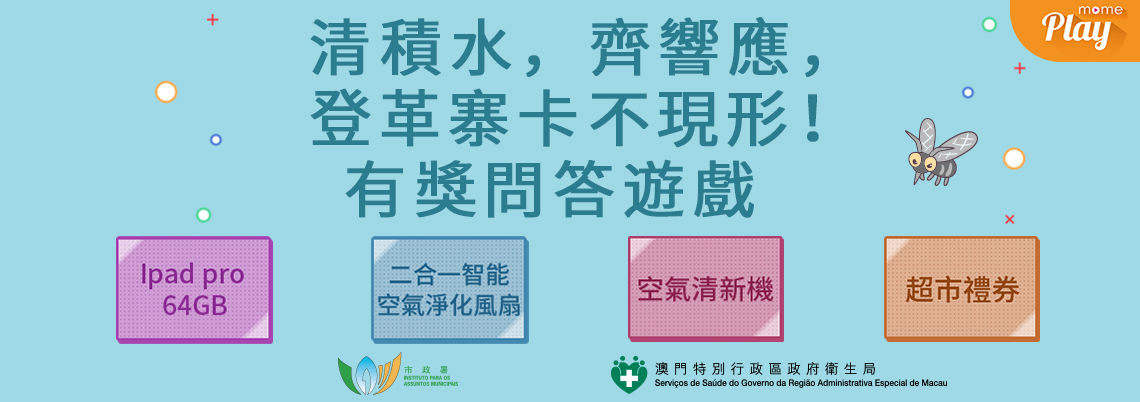 “清積水,齊響應,登革寨卡不現形!有獎問答遊戲”分兩個階段進行,第一階段已於5月順利舉行;第二階段將於7月1日至7月10日期間舉行,市民可以在市政署環境資訊網(www.iam.gov.mo/macaohygiene/c/index)掃瞄二維碼進入遊戲,或於本澳具支援微信內“搖一搖”功能的公共巴士上,透過微信“搖一搖”進入遊戲。