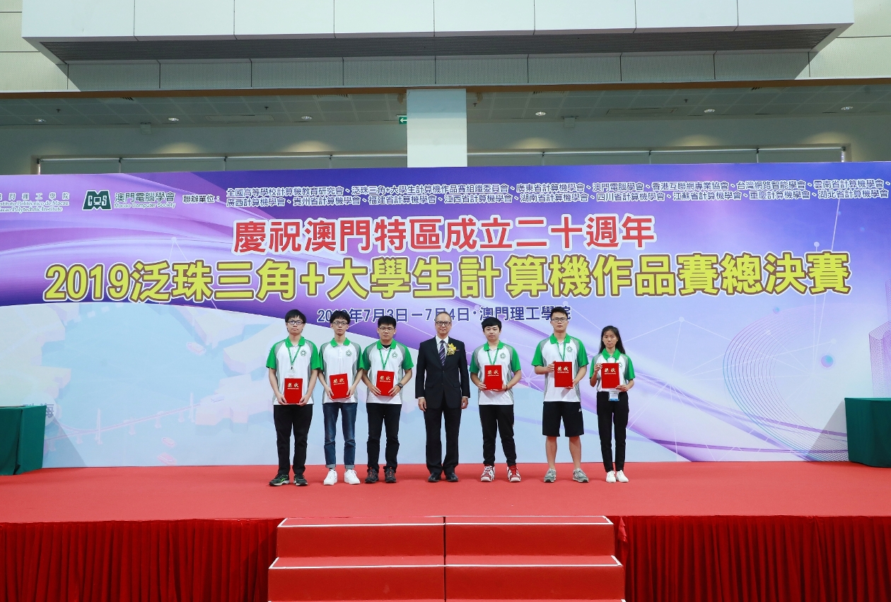 「2019泛珠三角+大學生計算機作品賽」總決賽頒獎禮於7月4日下午3時30分在澳門理工學院體育館舉行,由高等教育局局長蘇朝暉、澳門理工學院院長嚴肇基、中國科學院院士陳國良、澳門電腦學會會長溫錦明、廣東省科學技術協會黨組成員、專職副主席吳煥泉、泛珠三角+大學生計算機作品賽組委會主席團主席、全國高等學校計算機教育研究會副會長朱慶生等主持。澳門理工學院院長嚴肇基在致辭中表示,今年適逢澳門特區成立20周年,2019泛珠三角+大學生計算機作品賽總決賽在澳門舉辦,為澳門回歸祖國20周年增添精彩。該項賽事經過十多年的發展,已成為一項賽制成熟、影響廣泛、深受社會各界認同的全國性資訊科技大賽,在學術和技術領域內具有重要的地位,對計算機及相關技術的普及與推廣有積極的意義。而今年賽事規模之大,參與度之廣,充分體現了《粵港澳大灣區發展規劃綱要》得到深入的貫徹,科技創新已成為大灣區發展的新趨勢。粵港澳大灣區具有廣大的發展前景,將會成爲世界級的科創中心,給從事計算機、工程等領域的的同學、老師創造成績、實現理想提供了巨大的機遇。澳門電腦學會會長溫錦明致詞時表示,在慶祝澳門特區政府成立二十周年之際,也是《粵港澳大灣區發展規劃綱要》發佈的時刻,我們齊聚在澳門理工學院舉行盛大的比賽,是海峽兩岸暨港澳地區交流合作的好機會,《粵港澳大灣區發展規劃綱要》賦予澳門新的歷史使命和時代擔當,將澳門列為大灣區發展建設的四個“中心城市”之一,使澳門具有“核心引擎”的地位,這是國家對澳門的高度信任和期待。