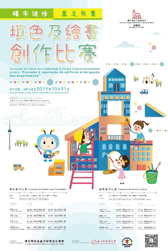 為了提升全澳市民對樓宇檢測、維修的意識,樓宇維修基金行政管理委員會以「樓宇維修 業主有責」為題舉辦填色及繪畫創作比賽,藉此培養學生推己及人的責任感。比賽收件日期由即日起至今年10月31日,而章程及報名表格可於房屋局官方微信帳號或網站(www.ihm.gov.mo)下載。