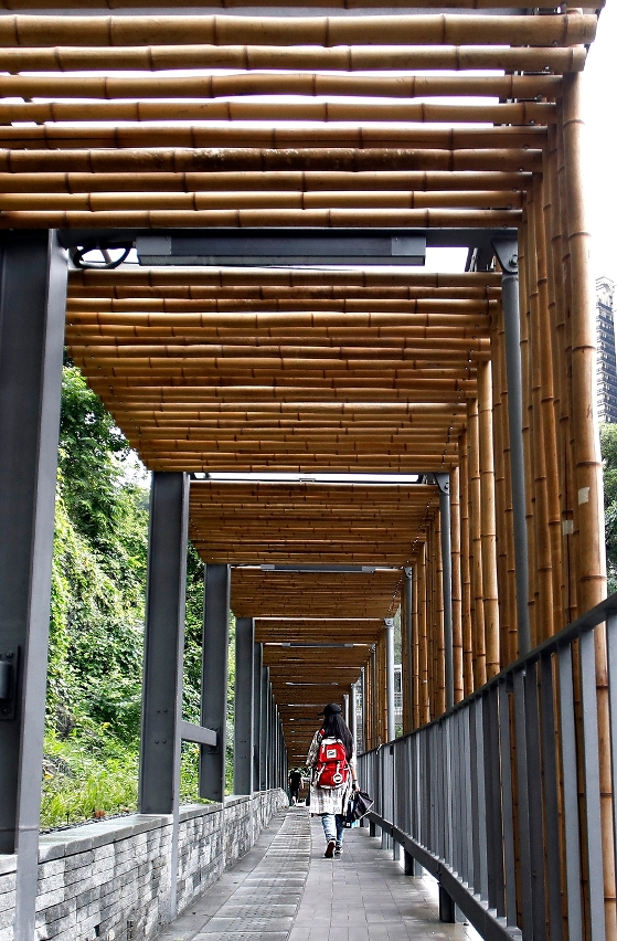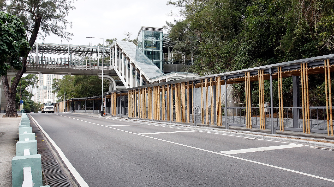 全長約800米的地面式走廊行人道設有玻璃頂蓋,提供遮風擋雨的功能。設計上以竹作裝飾,配合周邊大潭山的自然環境。除有金屬圍欄外,路邊還設置了花圃,以增加綠化及環保自然元素。