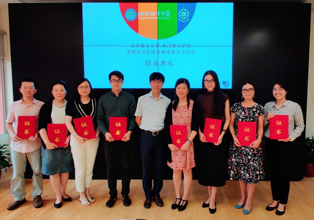 澳門理工學院與北京語言大學合辦的筆譯項目管理與翻譯技術培訓課程,經過連續十天的培訓學習,七月十七日圓滿結束,理工語言暨翻譯高等學校中英、中葡翻譯骨幹教師參加了此次培訓,主辦單位舉辦了簡單的結業禮,並向學員頒發了證書。