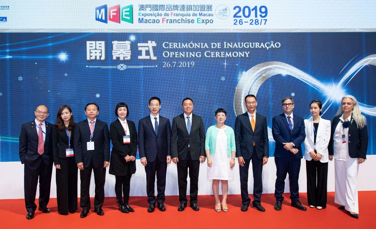 2019MFE開幕式主禮嘉賓還包括:澳門特別行政區經濟財政司司長梁維特、中央人民政府駐澳門特別行政區聯絡辦公室秘書長王新東、澳門國際品牌企業商會主席蕭婉儀、澳門連鎖加盟商會主席黃仁民、巴西特許經營商會國際項目經理Bruno Amado、社團法人台灣連鎖加盟促進協會國際事務主任周芳宇、香港專利授權及特許經營協會會長李偉生、中國連鎖經營協會創業與投資加盟部特許經營委員會辦公室主任蘇霜、新加坡特許經營及許可協會執行委員會成員江進興及葡萄牙特許經營協會理事長Cristina Maria Matos。