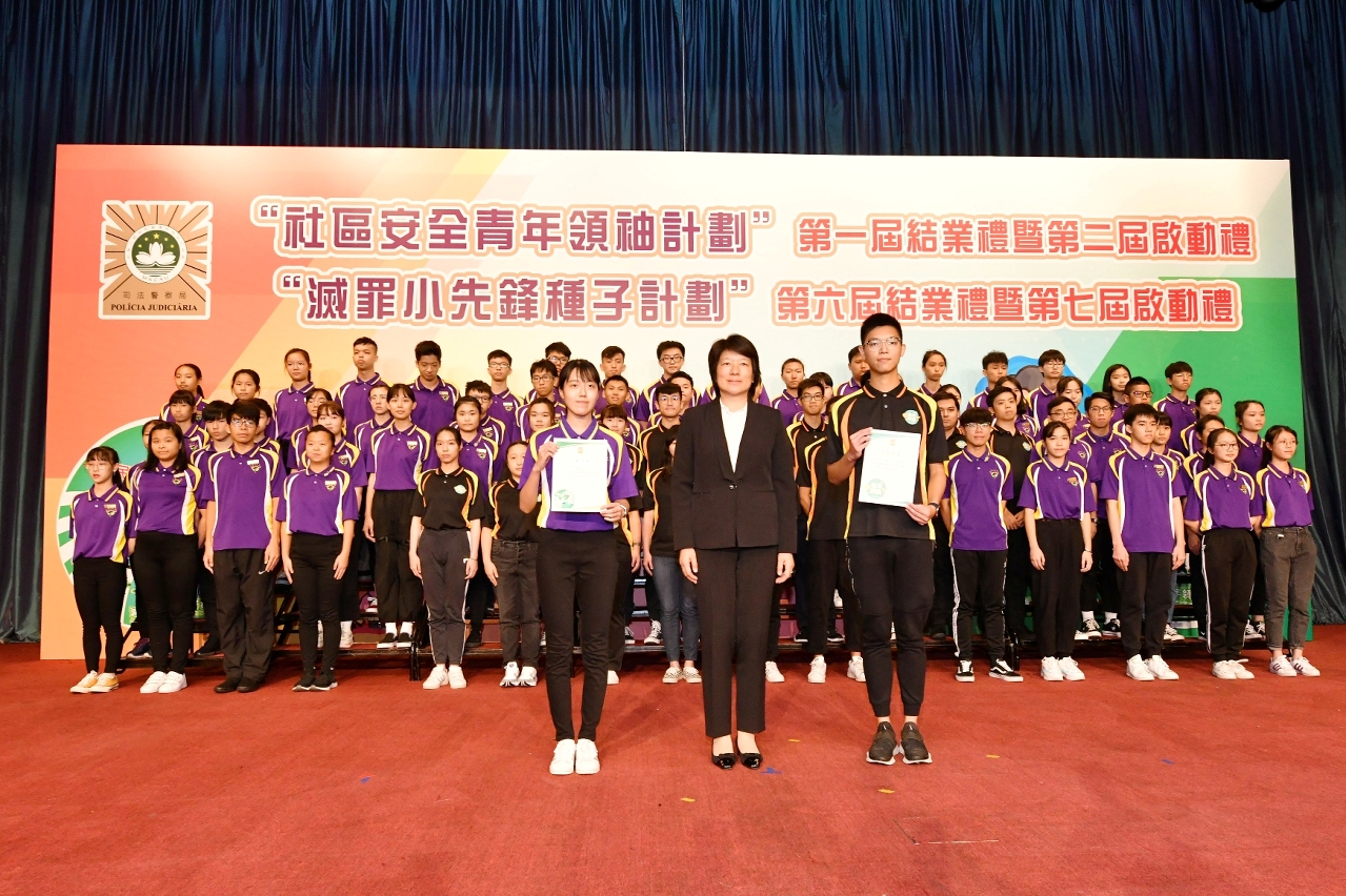 為積極配合和落實澳門特區政府的青年政策,提升青少年的防罪意識和能力,司法警察局舉行第一屆“社區安全青年領袖計劃”結業禮暨第二屆啟動禮、第六屆“滅罪小先鋒種子計劃”結業禮暨第七屆啟動禮。保安司司長黃少澤勉勵學員要把握國家發展機遇,努力提升自己,強化個人能力,從身邊小事做起,懂得尊師重道,勇於作出承擔,積極奉獻社會。司警局局長薛仲明期望全體學員能夠堅持不懈地學習、鞏固防罪和法律知識,從實踐中鍛煉和提高領袖能力,在朋輩間充份發揮自己的正面影響力,協助警方在社區及校園內外傳遞防罪滅罪訊息。