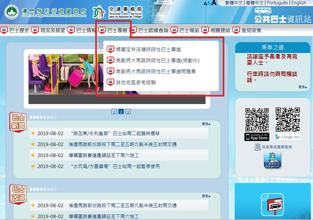 為讓公眾瞭解本澳巴士專道的實施情況及設置計劃,交通事務局即日起於轄下“公共巴士資訊站”網頁中新增“巴士專道”欄目http://www.dsat.gov.mo/bus/site/index.aspx,介紹媽閣至林茂塘時限性巴士專道的實施情況及效益、美副將大馬路道路優化工程及計劃設置之時限性巴士專道的詳情,以及其他地區參考經驗。有關內容會不定期更新,歡迎公眾瀏覽及關注。