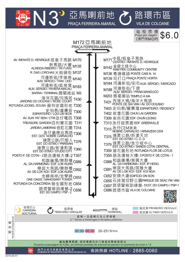 因應暑假結束,N3夜間巴士路線由9月1日(周日)凌晨零時起,恢復行程至“路環市區”站,循環線行駛至亞馬喇前地轉乘站,不行經黑沙海灘及竹灣海灘。服務時間為凌晨零時至清晨6時,班次頻率為每20至25分鐘一班。