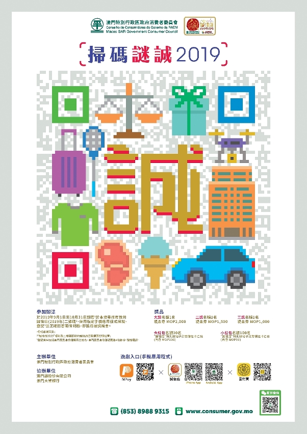 消委會為配合智慧城市發展,以及向居民推廣“誠信店”及獲得及時的消費維權資訊,消委會由9月1日起舉辦“掃碼謎誠 2019”活動,活動設有133份獎品,答對問題就可參加抽獎,有機會獲得2,000澳門元現金券大獎,歡迎居民踴躍參加。