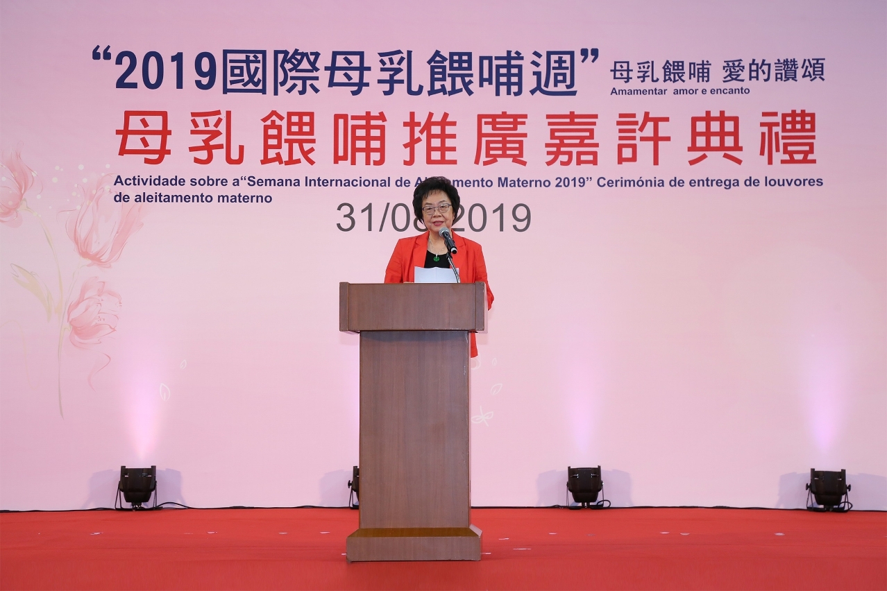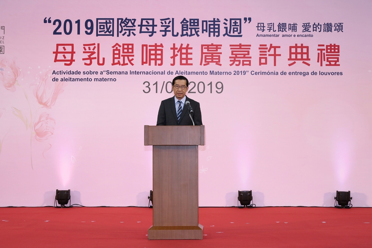 衛生局代局長鄭成業在致辭中表示,今年已是衛生局第四年舉辦“母乳餵哺嘉許典禮 ”,經過近年大力推廣,2018年出生的嬰兒曾以母乳餵哺率為92.72%,純母乳餵哺嬰兒達6個月或以上、繼續以母乳餵哺嬰兒至1歲或以上、餵哺2歲或以上的整體數據都得到持續提升,而自2016年社會文化司優先推動轄下部門增加母乳餵哺空間至今,已逐步推廣至其他政府部門及私營機構,截至今年8月底,全澳公/私營機構已設立226間母乳餵哺室(包括:社會文化司轄下14個部門的辦公地點及其管轄的場所共134間、其他政府部門共25間,私營企業合共67間。),成績令人鼓舞。衛生局為拓展支持母乳餵哺到社區上的不同階層,鼓勵機構/企業實施母乳友善工作間措施,讓返回職場的媽媽能夠持續餵哺,已推出「營造友善工作間計劃」,在短短3個月內,願意參與計劃的公/私營機構已達139間,標誌着本澳推廣母乳餵哺工作正踏入新里程,不再局限於醫療場所,獲得社會的廣泛支持與認同。