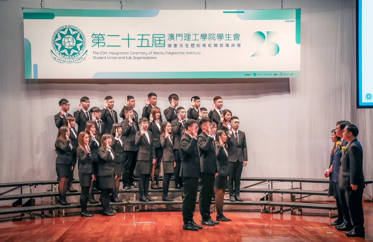 “第二十五屆澳門理工學院學生會總會及全體附屬組織就職典禮”日前在澳門理工學院禮堂隆重舉行。新一屆澳門理工學院學生會總會與附屬組織全體成員在中央人民政府駐澳門聯絡辦公室教育與青年工作部副處長岑嘉儀、高等教育局高等院校學生廳廳長陳旭偉等眾多嘉賓,及澳門理工學院院長嚴肇基見證下宣誓就職。
