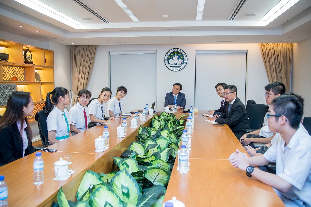社會文化司司長譚俊榮18日在特區政府總部會見第一屆澳門聯校科學展覽的學生籌備委員會一行,對學生們自發籌備聯校科學展予以讚賞,表示特區政府將支持學生們辦好展覽。