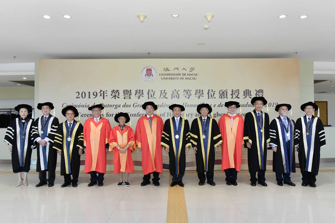 澳門大學今(9)日舉行“2019年榮譽學位及高等學位頒授典禮",向喬曉陽先生、劉羨冰女士、盧煜明教授和鍾志平博士頒授榮譽博士學位,以表彰他們的卓越成就、為社會發展和教育做出的重大貢獻。