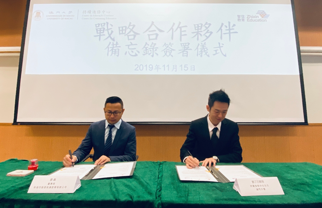 澳門大學持續進修中心與智信珠澳教育有限公司簽署戰略合作協議,計劃展開金融、健康科學、大數據等領域的培訓課程合作,部分培訓課程將於珠海澳大科技研究院舉辦。