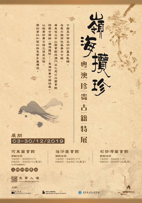 古籍是中華文明的重要載體,歷經無數烽火離亂、人世滄桑,大量古籍已經散佚,留存下來的古籍彌足珍貴。是次展覽將於何東圖書館、氹仔圖書館及石排灣圖書館同時展出約90幅古籍圖片,展示嶺南地區善本古籍,推廣古籍相關知識,當中包括何東藏書樓所藏中文古籍及澳門資料共28種,以圖文及目錄形式,展示典藏概況。