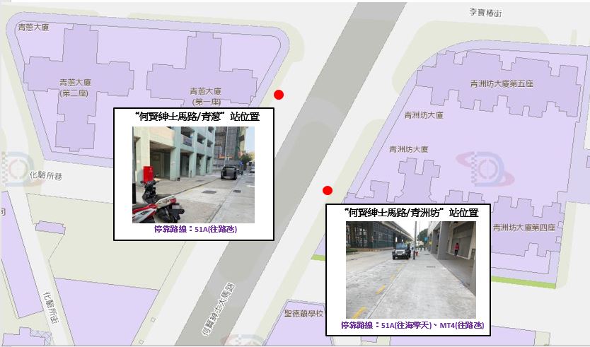 另外,為優化青洲坊之巴士路線安排,交通事務局同日調整51A路線,往路氹方向由原行駛沙梨頭北街及何賢紳士大馬路的行車天橋,改為行駛地面的道路,並停靠新增設於何賢紳士大馬路靠青葱大廈一側的“何賢紳士馬路/青葱"站;至於“何賢紳士大馬路"站亦同步遷移至青洲坊大廈旁,並更名為“何賢紳士馬路/青洲坊"站,停靠往海擎天方向的51A及往路氹方向的MT4路線。