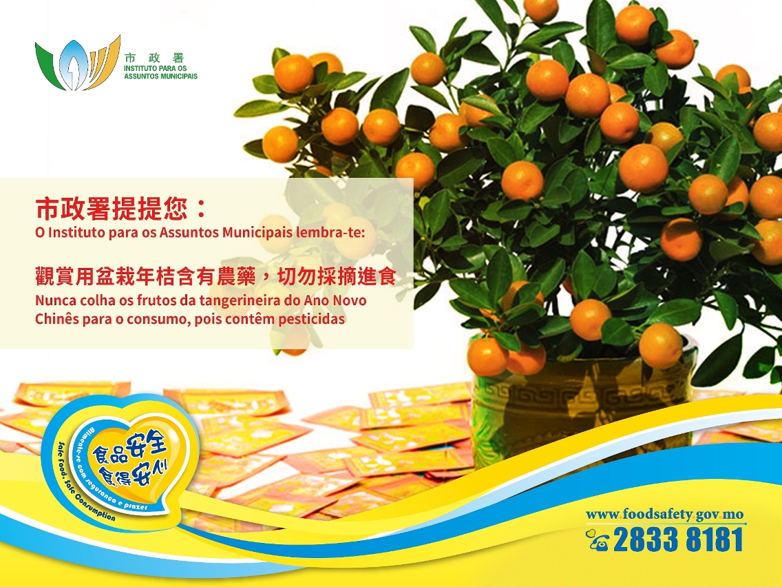春節期間,由於對蔬菜及肉類需求增加,市政署特別提醒公眾切勿私自攜帶依法須受檢疫而未經檢疫的肉類及鮮活食品入境,避免觸犯相關法例,共同保障食品安全及衛生防疫。市民在歡度佳節的同時,亦需注意食品安全及個人衛生,進食前應用皂液及清水徹底清洗雙手,共餐時宜使用公筷、公匙;生熟食品應分開處理,在處理生食和熟食之間要洗手,避免交叉污染;更要確保食物徹底煮熟及加熱方可進食,如對食物衛生狀況及品質有疑慮應停止食用。市民外出用餐時,應選擇有良好衛生環境及具信譽的商戶,切勿光顧街邊的無牌攤販及來源不明的食品。而用於佈置環境的觀賞性年桔並非為食用而栽種,在裁種或上市前通常施上農藥,所以切勿採摘食用或醃製食用。