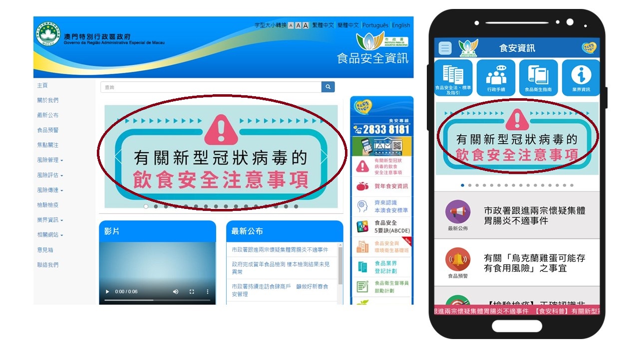 市政署已於食品安全資訊網開設「賀年食安資訊」及「有關新型冠狀病毒的飲食安全注意事項」專頁,公眾可登入www.foodsafety.gov.mo或下載「食安資訊」手機應用程式,獲取一系列資訊。