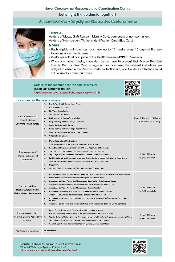 為落實「全民參與 共同抗疫」,衛生局自明(2)日起,亦將開展新一輪保障口罩供應澳門巿民計劃,凡持永久/非永久居民身份證或外地僱員身份認別證(俗稱“藍咭”)的人士可持正本前往各衛生中心、衛生站、衛生局協議藥房,澳門工會聯合總會、澳門街坊會聯合總會及澳門婦女聯合總會轄下各服務點(共89個地點)登記購買,每人每次可買10個口罩,10日後可再次購買,居民按需到就近地點登記購買。衛生局提醒市民購置口罩時要檢查清楚,避免購置到有質量問題的口罩。詳細資料可登入衛生局「抗疫專頁」https://www.ssm.gov.mo/PreventWuhaninfection進一步了解。