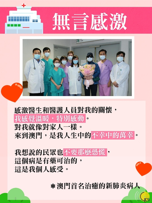澳門首名治癒的新型肺炎病人:感激澳門醫護人員照顧。來到澳門是我不幸中的萬幸。