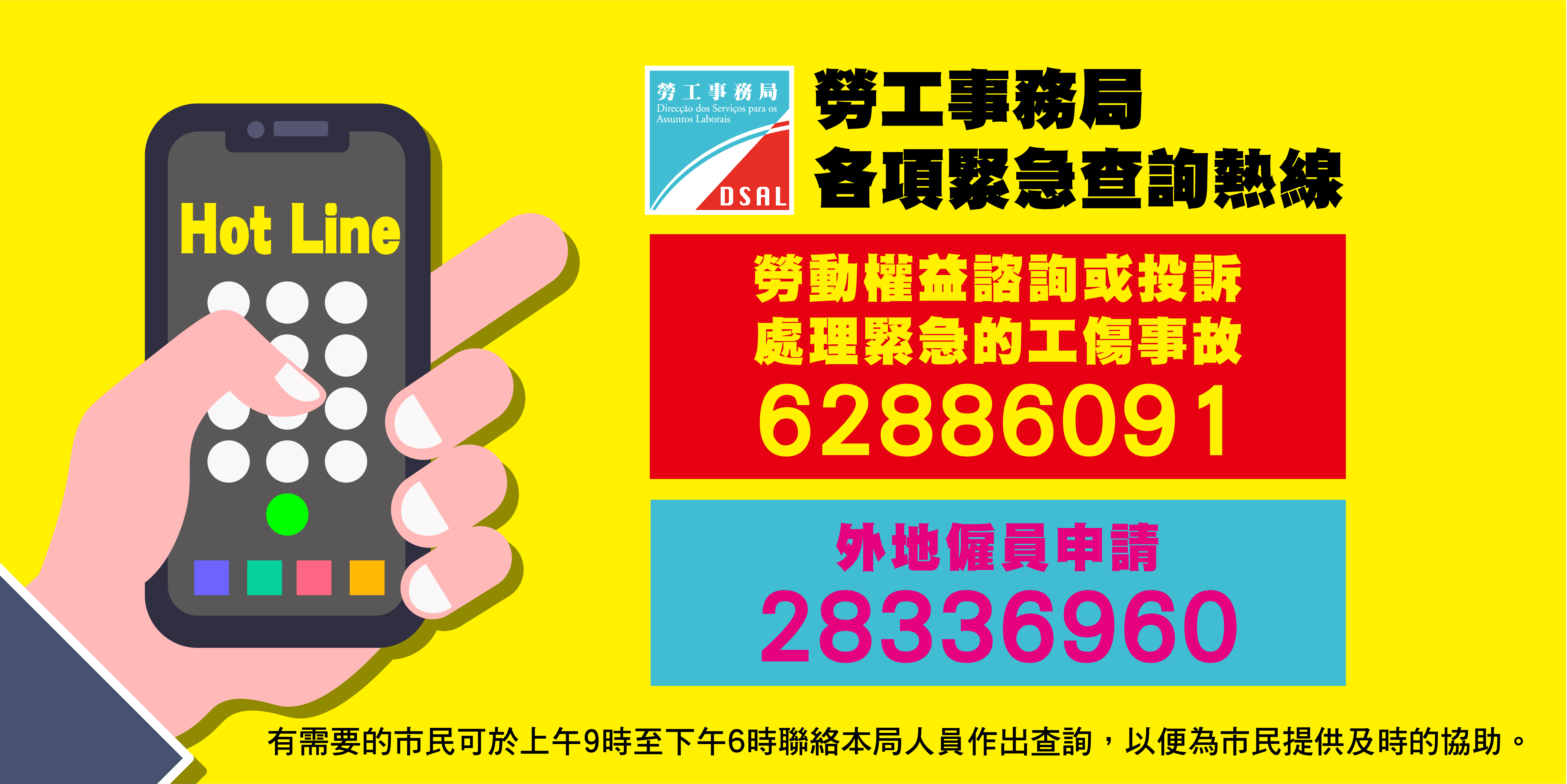 為配合特區政府的防疫工作,勞工事務局所有對外服務點至本月16日期間將繼續暫停開放。但是,於此期間,勞工事務局已安排工作人員當值,如市民有勞動權益諮詢或有緊急的投訴事件,可於早上9時至下午6時,致電緊急熱線電話62886091,與本局職員聯絡,以便能適時提供協助。