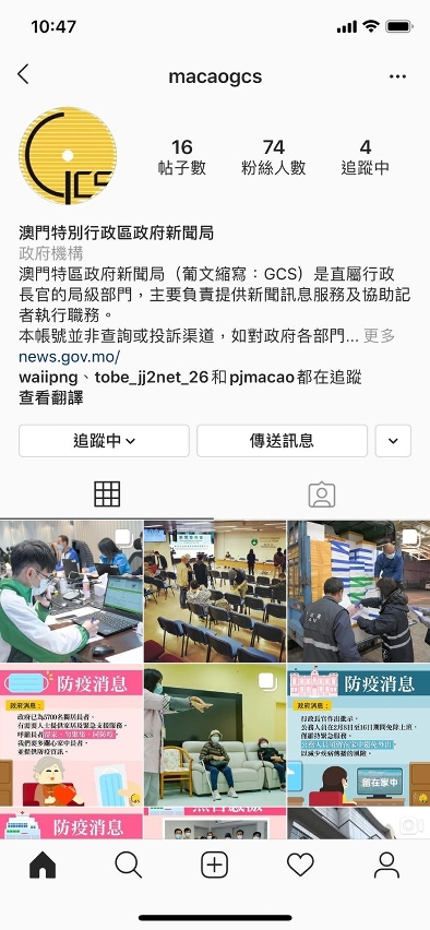 “macaogcs”帳號近期將集中提供有關本澳應對新型冠狀病毒疫情的照片、視訊及圖文包等,讓公眾接收政府防疫、抗疫的多樣資訊,共同應對疫情。公眾可在Instagram上搜尋“macaogcs”、或掃瞄相關QR Code、又或透過 https://www.instagram.com/macaogcs/ 連結,追蹤新聞局IG帳號。