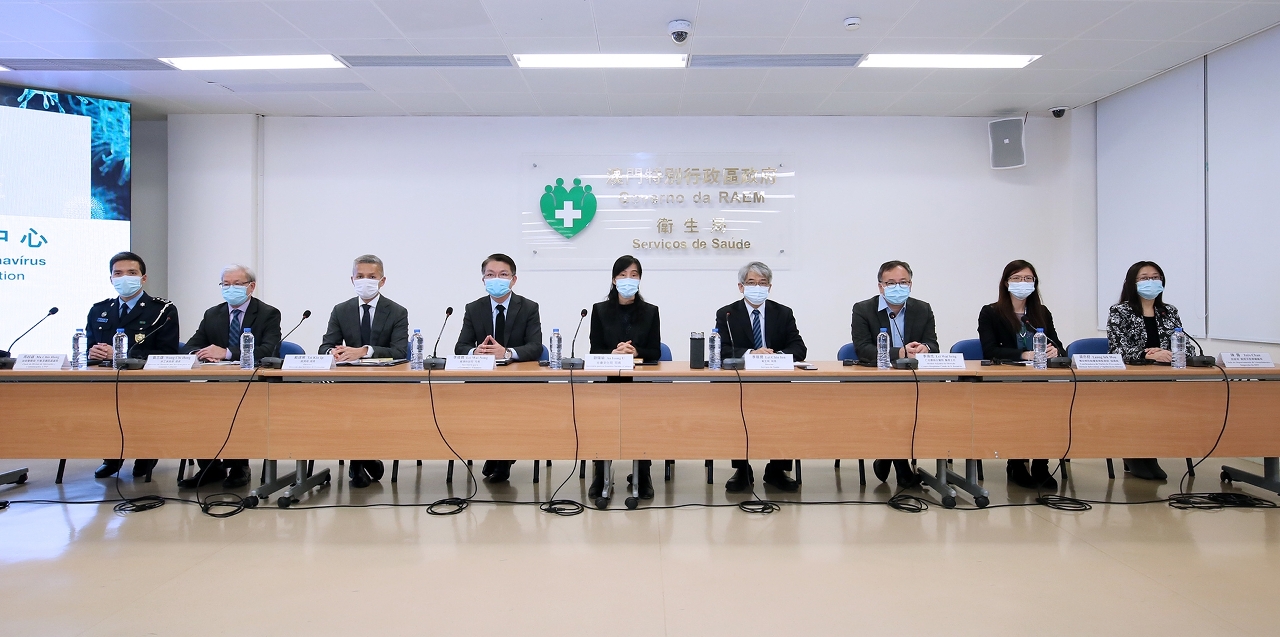 新型冠狀病毒感染應變協調中心(下稱應變協調中心)於今(15)日舉行“新型冠狀病毒最新情況及本澳各項防控措施”新聞發佈會,社會文化司歐陽瑜司長、經濟財政司李偉農司長、經濟局戴建業局長、勞工事務局黃志雄局長、衛生局李展潤局長、仁伯爵綜合醫院李偉成醫務主任、疾病預防控制中心傳染病協調員梁亦好醫生、旅遊局執照及監察廳陳露廳長、治安警察局行動及通訊處馬超雄處長共同會見傳媒。