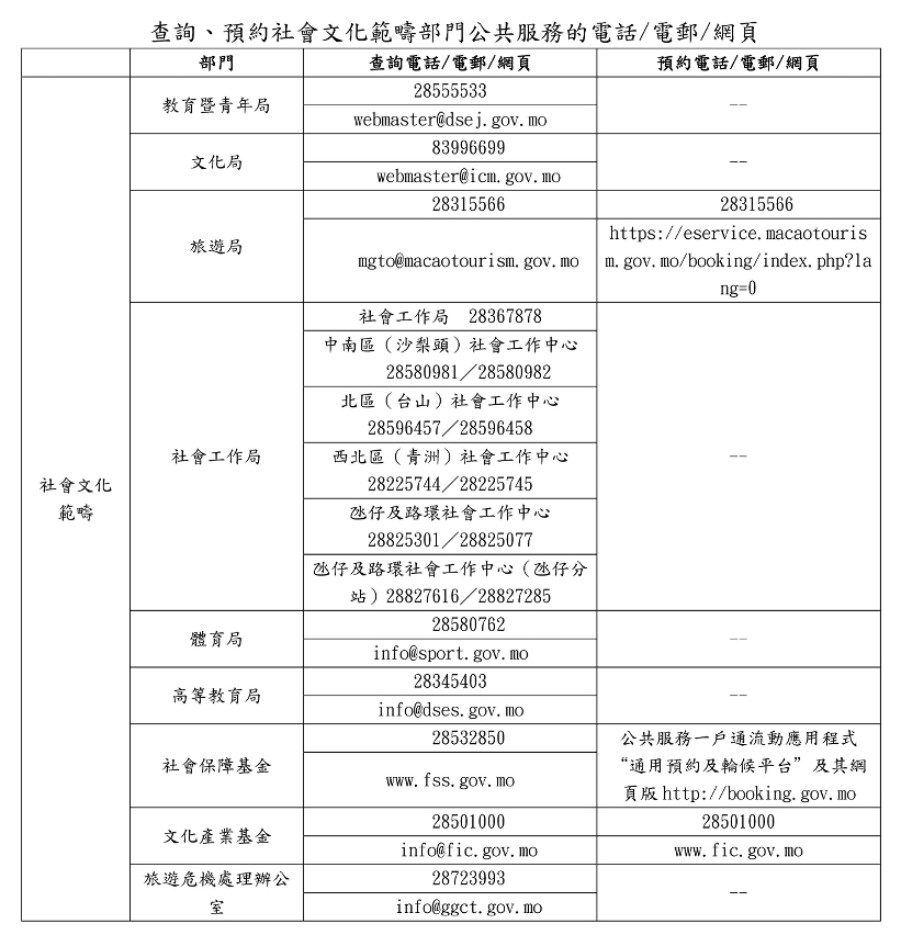 查詢、預約社會文化範疇部門公共服務的電話/電郵/網頁