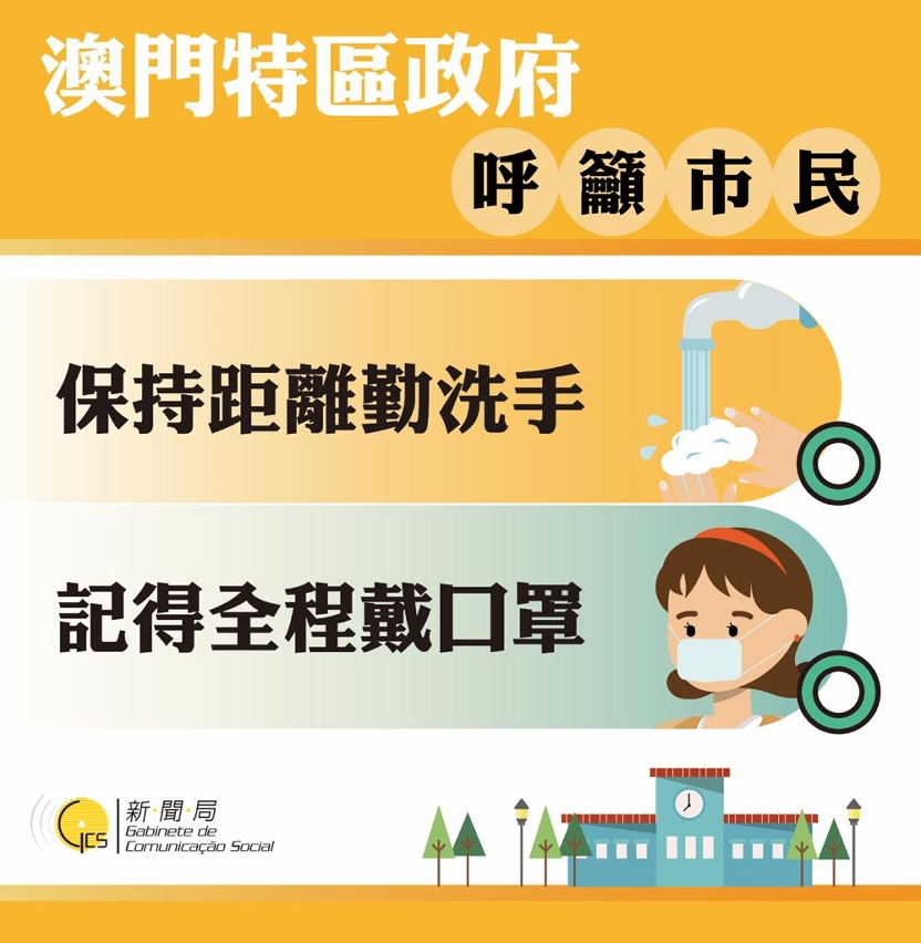 政府調整在公共地方播放的宣傳口號-「特區政府呼籲:為人為己,減少出門,避免聚集,戴好口罩,記得洗手。」