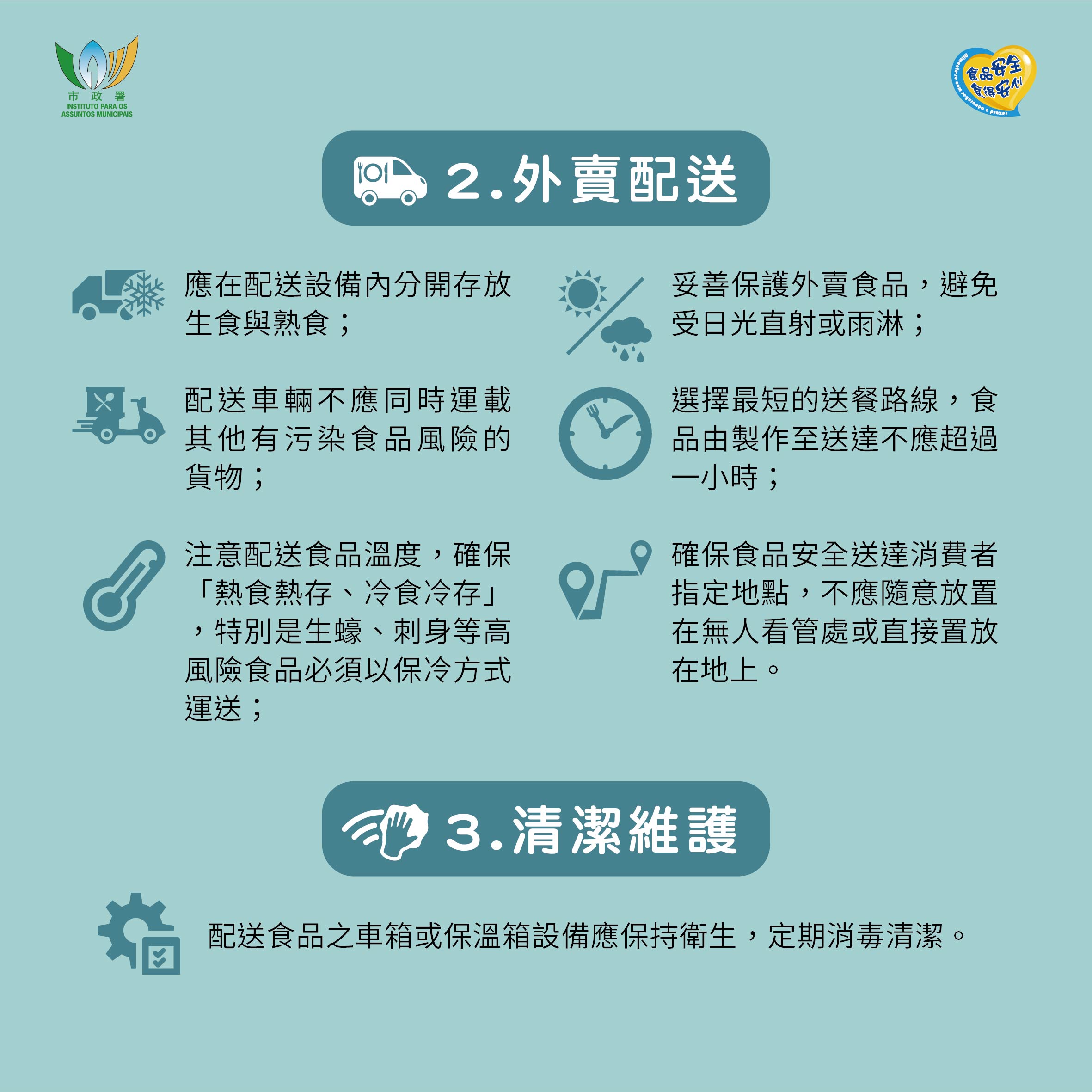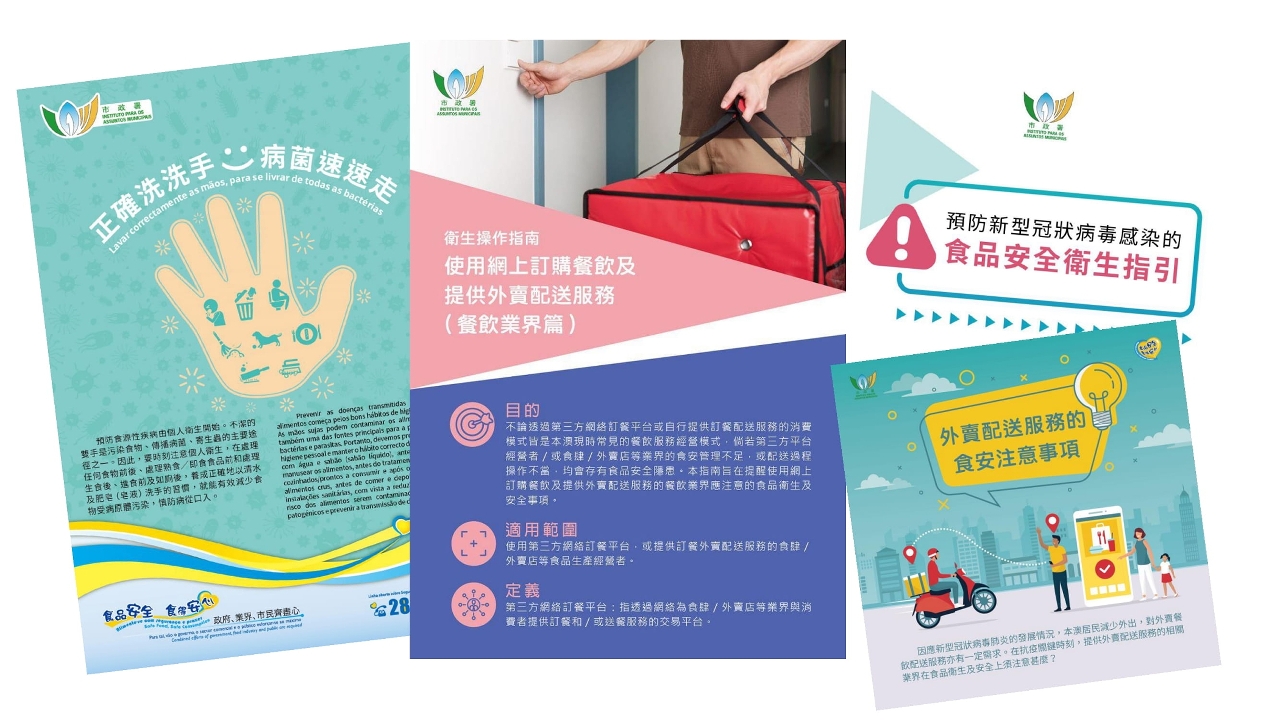 為提升本澳食品業界的食品安全與衛生意識,市政署持續派員走訪本澳食品生產經營場所,派發指引、小冊子及海報,指導商戶正確執行預防工作。亦製作了《外賣配送服務的食安注意事項》圖文包,提醒業界在提供外賣配送服務時,須注意的食品安全、個人及環境衛生,共同降低疾病在社區傳播的風險。