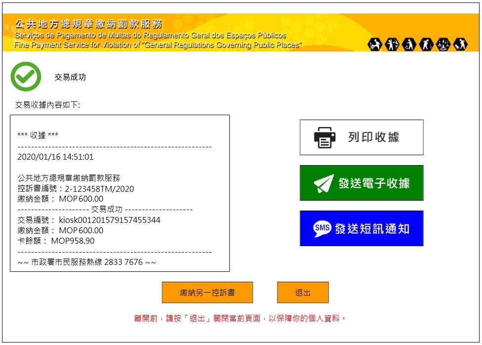 為落實特區政府的電子政務工作,市政署與身份證明局合作,在多功能自助服務機加入「公共地方總規章繳納罰款服務」,為大眾提供更多元、更便捷的繳費渠道和繳付方式。