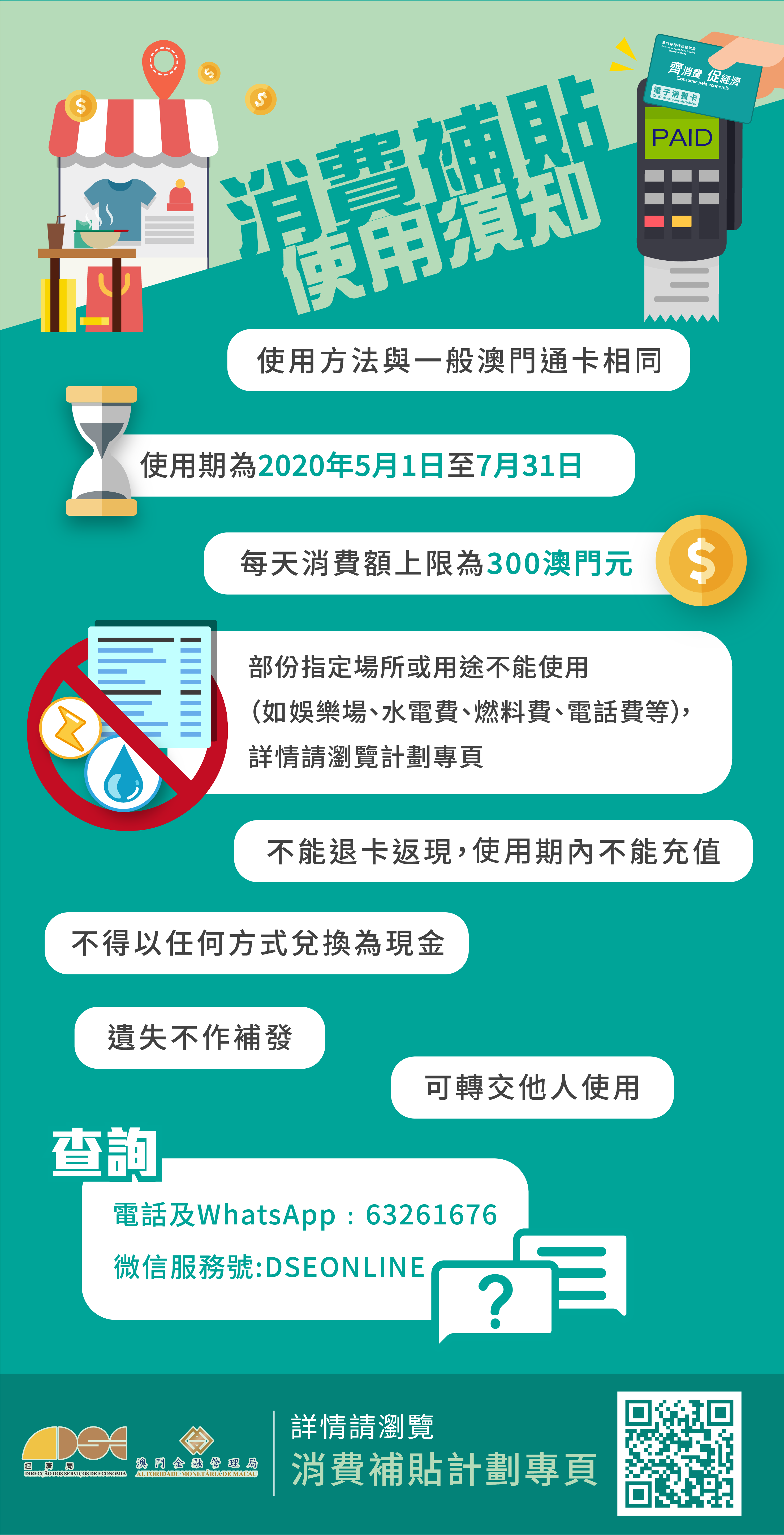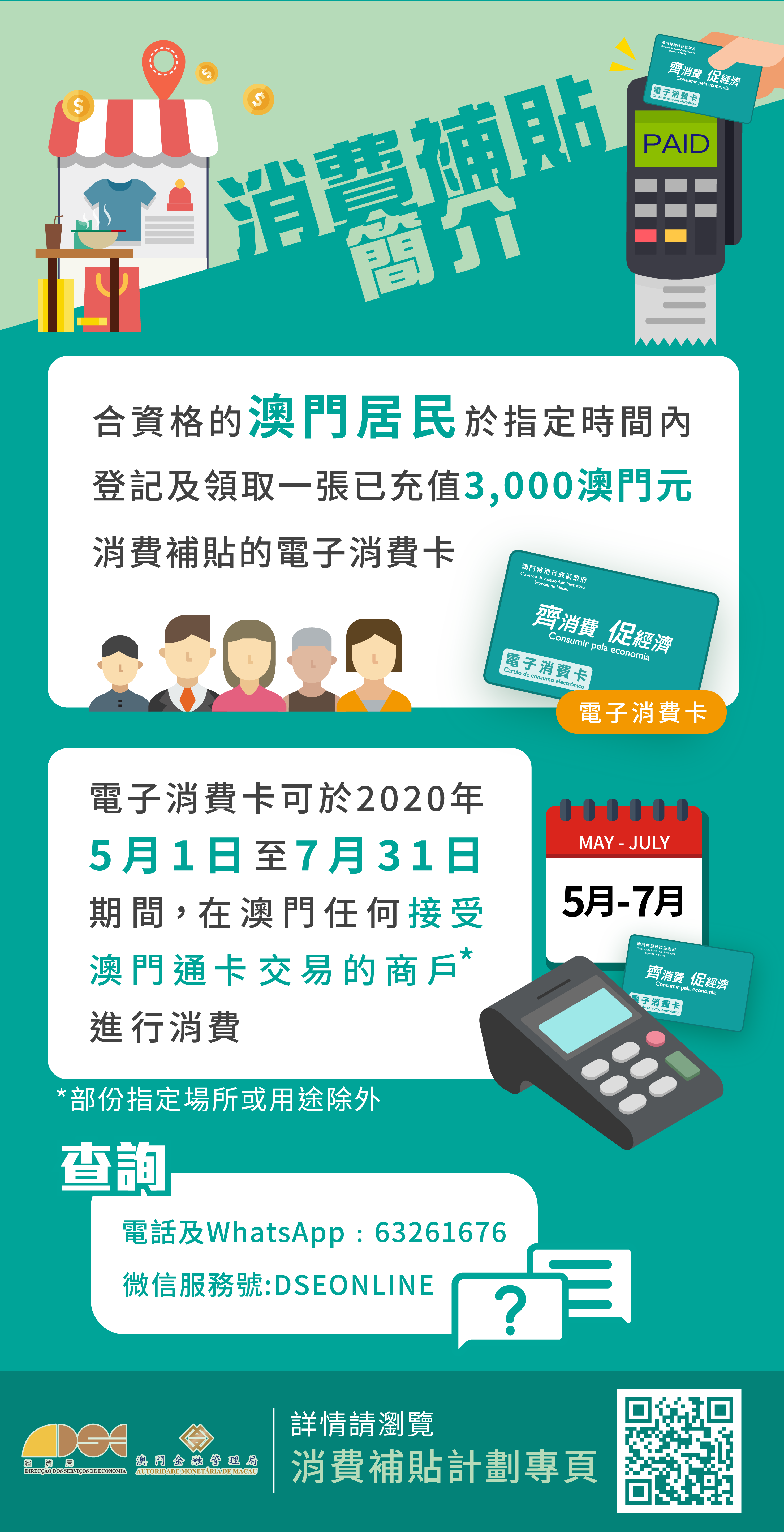 3. 市民亦可透過Whatsapp (6326 1676)、微信服務號(“經濟局服務在線”/“DSEONLINE”)或電郵(consumo@economia.gov.mo)等線上方式查詢計劃的相關資訊。
