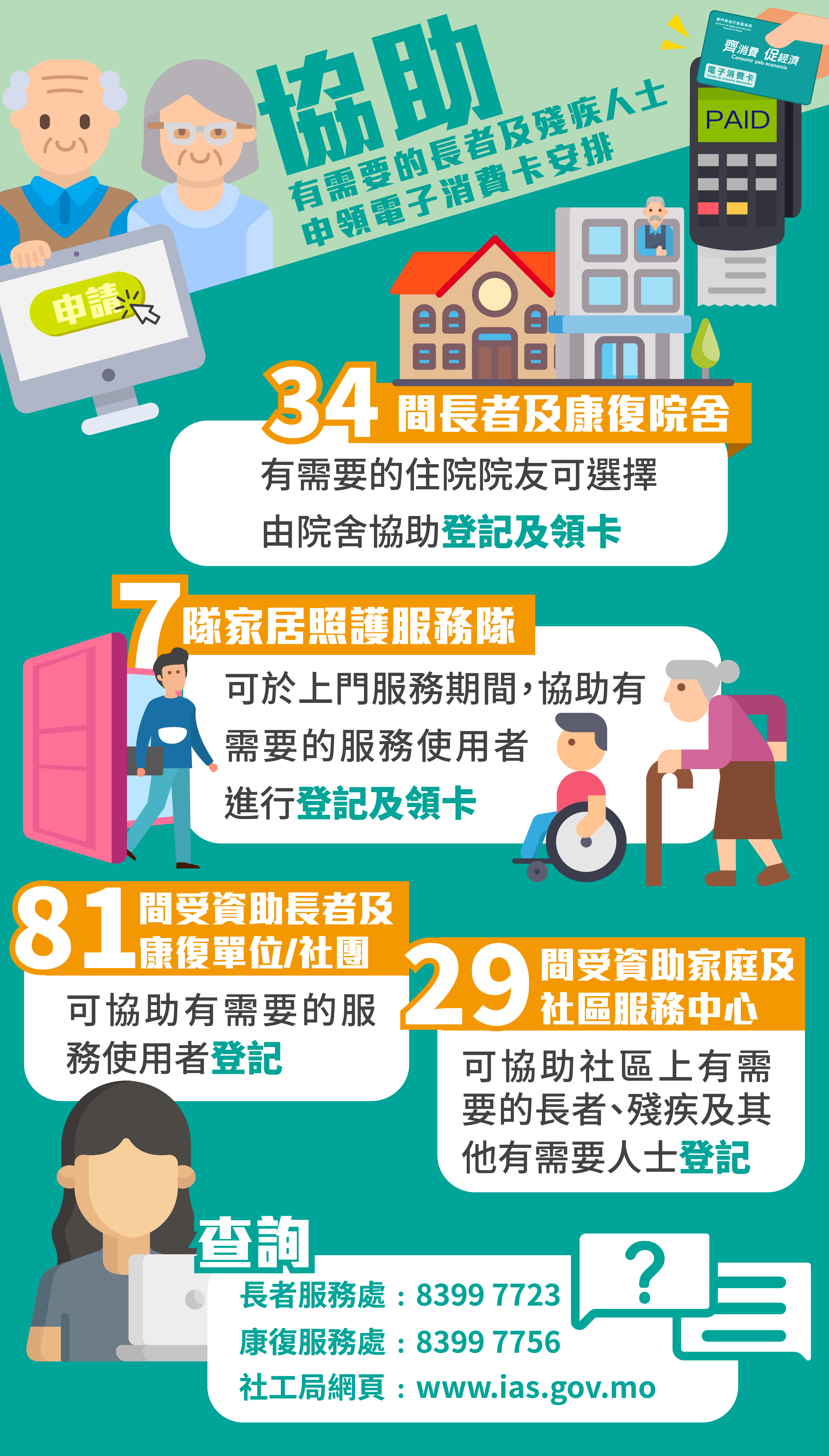 1. 考慮到部分長者及殘疾人士在申領程序上可能有需要協助,因此社會工作局已協調本澳社會服務機構,為有需要協助的長者及殘疾人士,辦理電子消費卡申領手續;