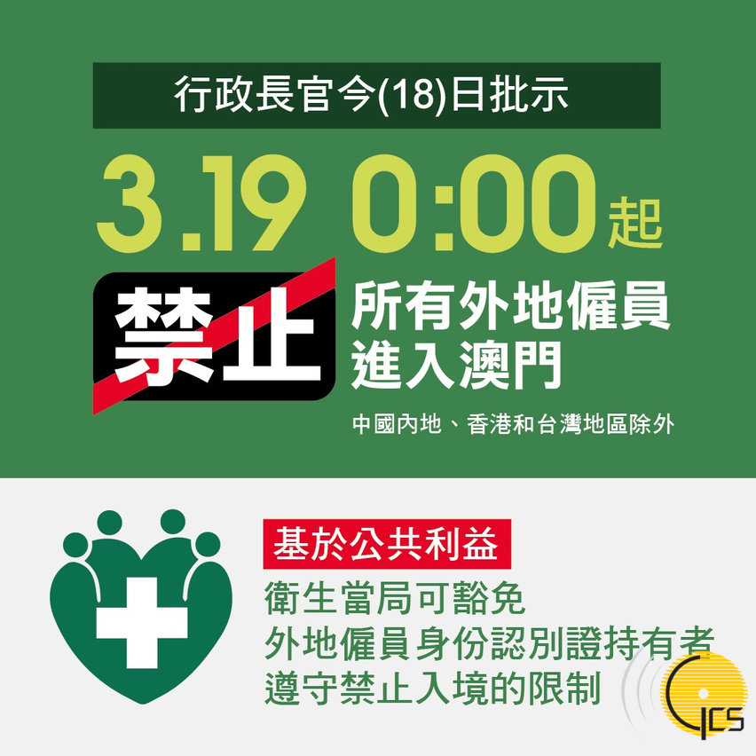 考慮到新型冠狀病毒感染疫情在世界各地不斷擴散,為防範外來感染個案的輸入,保障澳門居民的健康。行政長官今日批示,3月19日零時起,禁止所有外地僱員身份認別證持有者進入澳門特別行政區,但擁有中國內地、香港特別行政區和台灣地區居民身份的外地僱員身份認別證持有者除外。