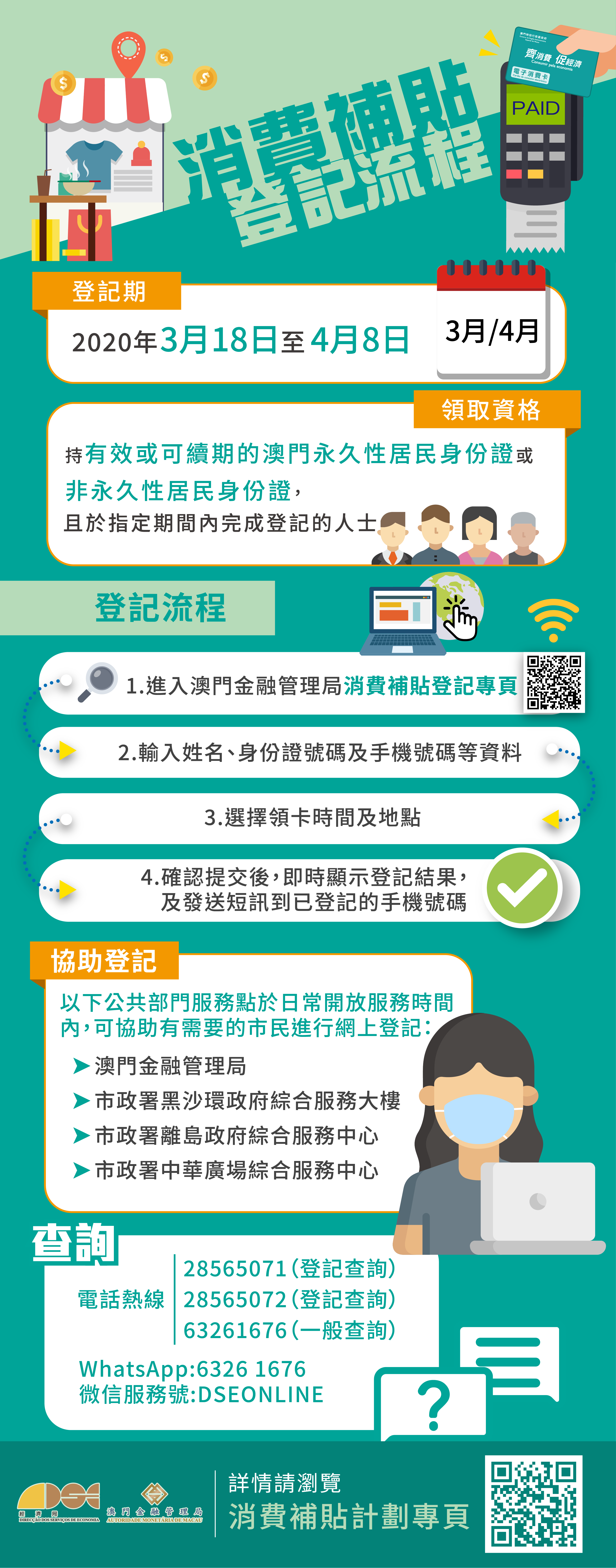 為方便市民登記,澳門金融管理局除開設網上登記專頁外,澳門金融管理局、市政署的政府綜合服務大樓、離島政府綜合服務中心及中華廣場綜合服務中心亦設置服務點,協助市民進行網上登記。而中國銀行的23間分行及大西洋銀行總行,亦提供協助登記服務。