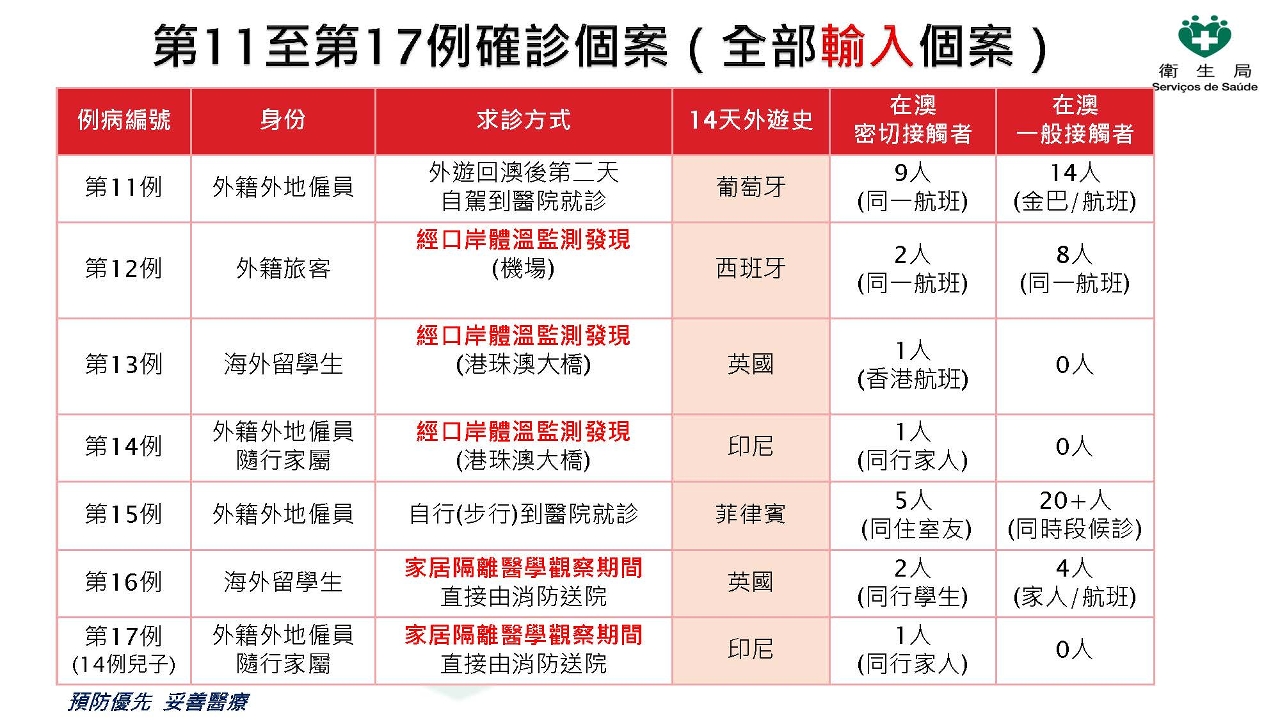 應變協調中心表示,本澳至今新增至17例新型冠狀病毒肺炎確診個案,第11例至第17例全部為輸入個案。