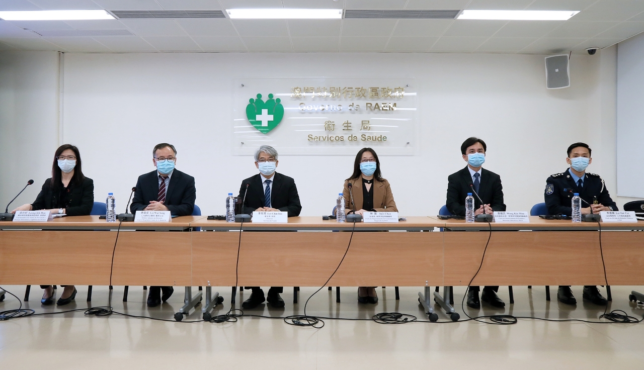 新型冠狀病毒感染應變協調中心(下稱應變協調中心)於今(19)日舉行例行記者會,衛生局李展潤局長、旅遊局執照及監察廳陳露廳長、教育暨青年局教育研究暨資源廳黃健武廳長、仁伯爵綜合醫院醫務主任李偉成醫生、治安警察局公共關係處李德輝處長、疾病預防控制中心傳染病協調員梁亦好醫生共同會見傳媒。