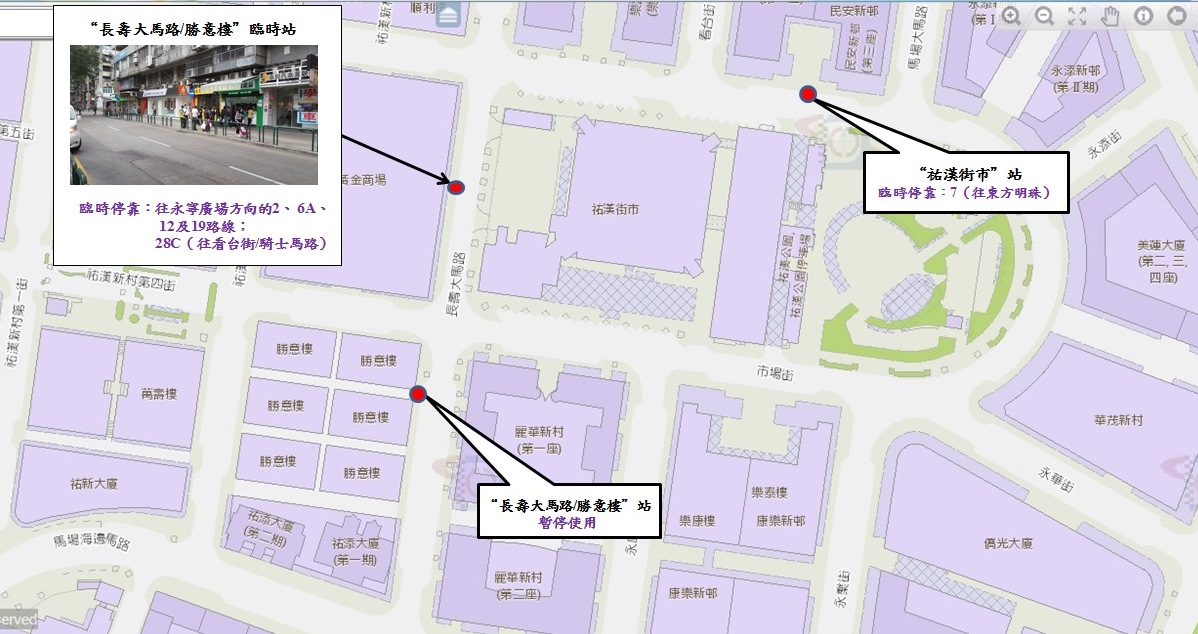 巴士方面,3月24日(周二)上午10時起,“長壽大馬路/勝意樓”站往祐漢新村第六街方向臨時遷移約80米,供選乘2、6A、12、19及28C路線巴士之乘客搭乘,而選乘7路線之乘客則可到“祐漢街市”站搭乘。