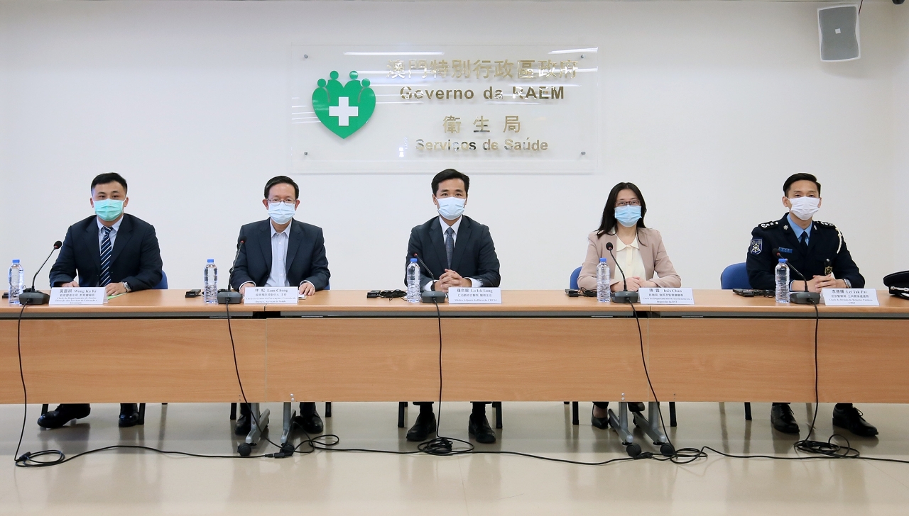 新型冠狀病毒感染應變協調中心(下稱應變協調中心)於今(21)日舉行例行記者會,仁伯爵綜合醫院醫務主任羅奕龍醫生、疾病預防控制中心林松主任、旅遊局執照及監察廳陳露廳長、教育暨青年局教育廳黃嘉祺廳長及治安警察局公共關係處李德輝處長共同會見傳媒。