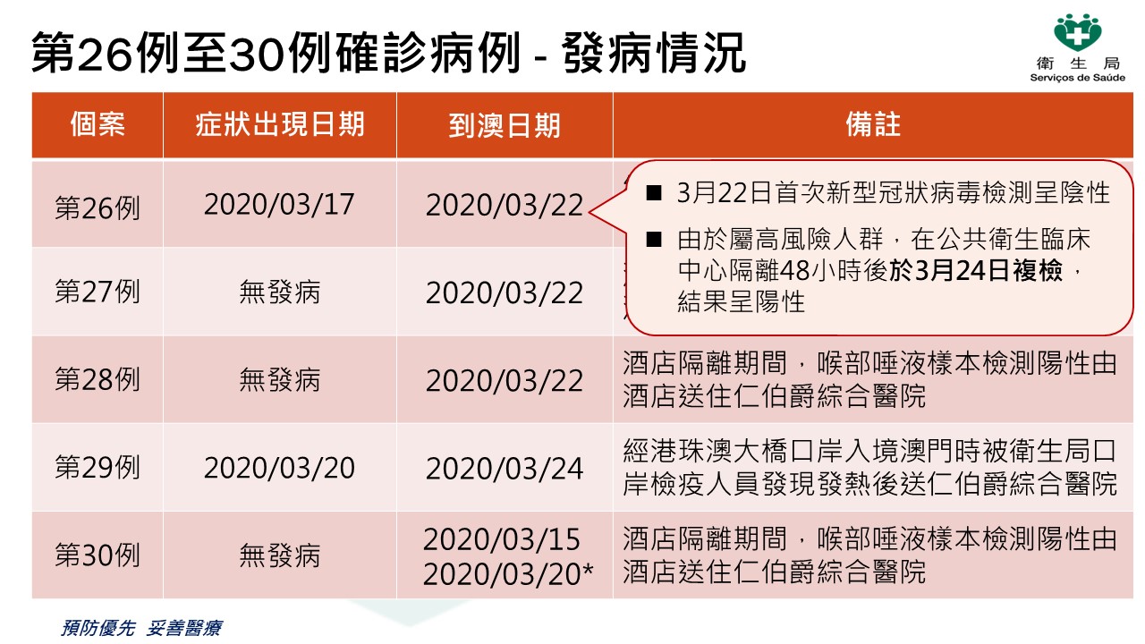 應變協調中心表示,第30例患者為澳洲籍旅客,本月16至20日入住路環澳門竹灣酒店,期間主要在酒店及海灘逗留,只於19日曾離開酒店,乘坐26A巴士。經評估後,由於他主要在戶外較開揚的地方逗留,且全程有佩戴口罩,相信傳播病疫的風險較低。