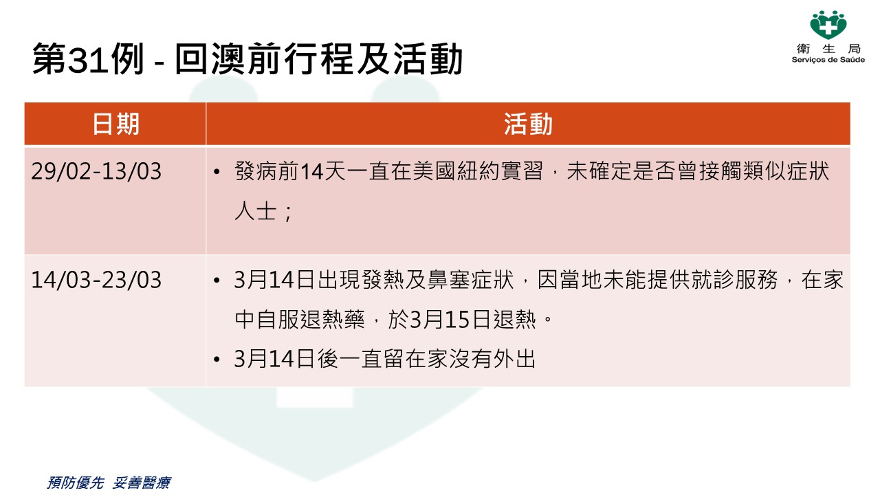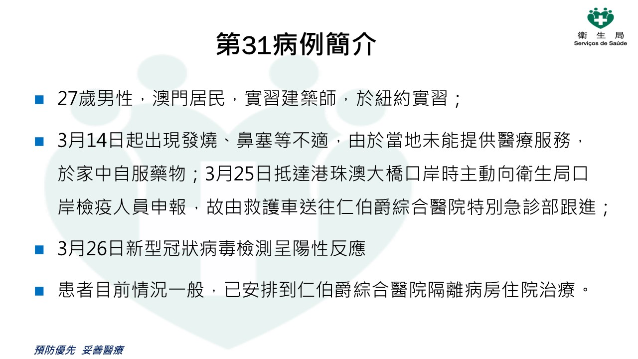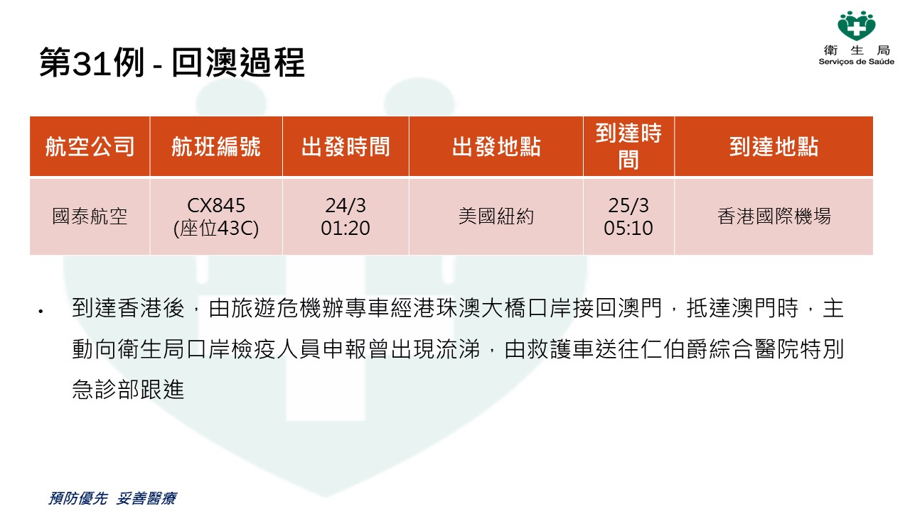 患者為27歲,澳門居民,男性。3月14日,在美國已出現發燒、鼻塞等不適,在家中自服退熱藥。3月24日,乘坐國泰航空(CX845,座位43C),3月25日抵達香港國際機場,並乘坐旅遊危機辦專車經港珠澳大橋口岸回澳門,抵達澳門時,主動向衛生局口岸檢疫人員申報曾出現流涕。3月26日新型冠狀病毒檢測呈陽性反應。