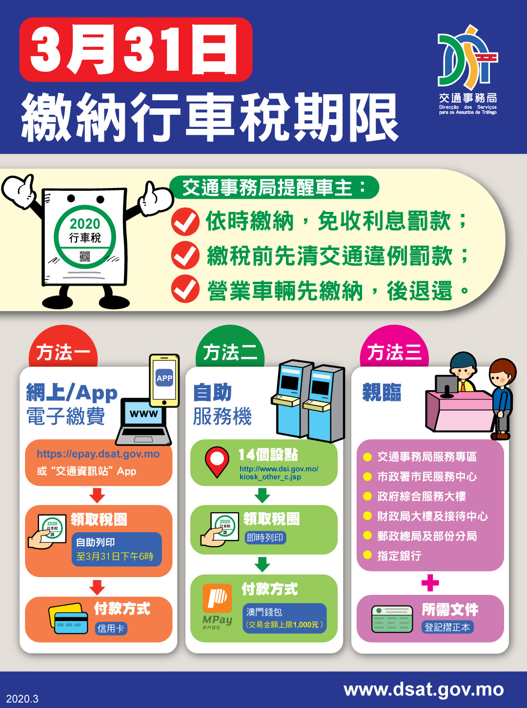 配合防疫工作,避免人群聚集輪候,車主可於下周二(3月31日)下午6時前登入交通事務局電子繳費網站https://epay.dsat.gov.mo或手機應用程式“交通資訊站”App辦理繳費手續,然後到自助服務機列印稅圈。車主亦可於本澳14個自助服務機的設點,使用“澳門錢包(MPay)”手機電子支付服務直接繳費(交易金額上限為1,000元)及即時列印稅圈(詳情可瀏覽身份證明局網頁http://www.dsi.gov.mo/kiosk_other_c.jsp)。