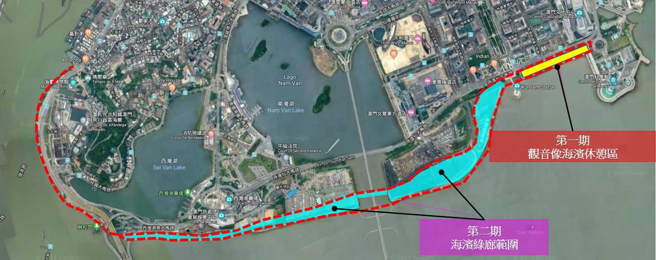澳門半島南岸海濱綠廊第一期工程觀音像海濱休憩區總面積約一點五萬平方米,由科學館至觀音像的一段海濱沿岸,將設兒童遊樂區、步行徑、茶座、多功能球場、健身康樂區、門球場、滾軸溜冰場等休閒康樂空間,並預留空間接駁第二期休憩區的單車徑,預計今年年底前完成建設,開放予市民使用。市政署將於今年內開展觀音像至媽閣的第二期澳門半島南岸海濱綠廊規劃設計。