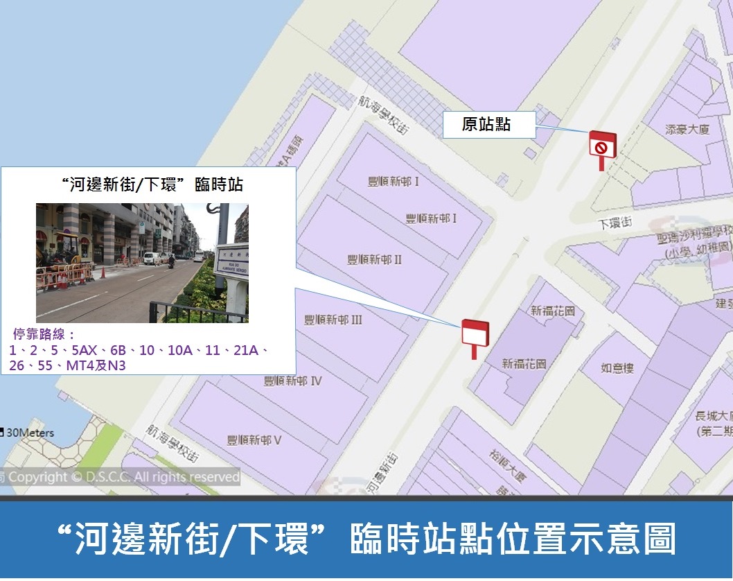 巴士方面,3月30日(周一)上午10時起,“河邊新街/下環”巴士站臨時往媽閣廟方向遷移約80米,搭乘1、2、5、5AX、6B、10、10A、11、21A、26、55、MT4及N3路線巴士之乘客須於臨時站上落,直至工程完結。