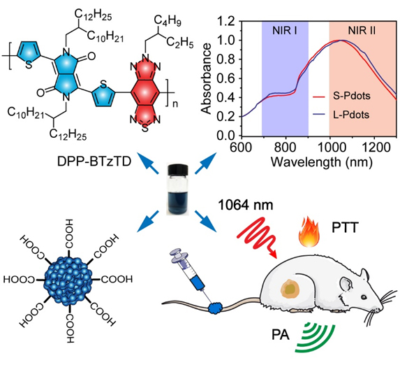 袁振的團隊通過優化共軛聚合物的帶隙結構及改良的自組裝方法,設計合成了一種新穎的超小型多功能近紅外二區強吸收的聚合物點(DPP-BTzTD Pdot)。這種新型的聚合物點具有良好的光穩定性、光吸收能力、生物相容性、光聲信號以及光熱轉化效率(53%)。通過小鼠腫瘤模型,進一步活體驗證了聚合物點高效的腫瘤消融能力以及通過腎臟系統的快速排泄能力。體內、體外試驗均表明聚合物點在光功率密度僅0.5 W cm-2的1064 nm照射下便具有顯著的光熱治療性能,遠低於其最大允許光功率密度輻射值1 W cm-2。因此,該研究為有機半導體納米探針的臨床轉化應用開闢了一條新途徑。研究由袁振主導,主要參與者為其博士生門孝菊,並得到澳門大學及澳門科學技術發展基金的資助。