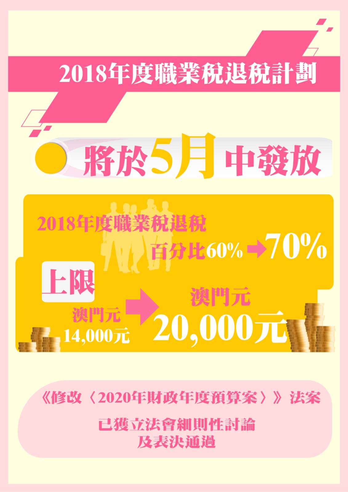 為應對受新型冠狀病毒肺炎的影響,特區政府推出的其中一項紓解民困措施:調升退還2018年度職業稅稅款的百分比及上限,百分比由原來60%調升至70%,上限則由原來14,000元調升至20,000元。有關《修改〈2020年財政年度預算案〉》法案今日獲立法會細則性討論及表決通過,財政局將於5月中發放2018年度職業稅退稅。